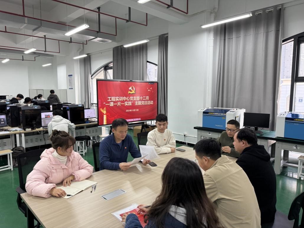2025年12月19日下午,工程实训中心党支部组织开展十二月份“一课一片一实践”主题党日活动,活动由支部书记汤希玮同志主持,全体党员参加。